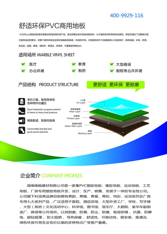 PVC地板是一種以半硬質(zhì)聚氯乙稀,PVC樹(shù)脂和天然石粉為主料,在高溫高壓條件下,經(jīng)過(guò)特殊生產(chǎn)工藝制成的綠色環(huán)保的新型輕體地面材料。產(chǎn)品紋路逼真美觀、超強(qiáng)耐磨,表面光亮而不滑,環(huán)保無(wú)毒、耐磨、耐刮擦,還能防滑、防水、防火等優(yōu)點(diǎn)。現(xiàn)在世界上各大醫(yī)院,幼兒園都以此種材料作為地面裝飾首選材料。