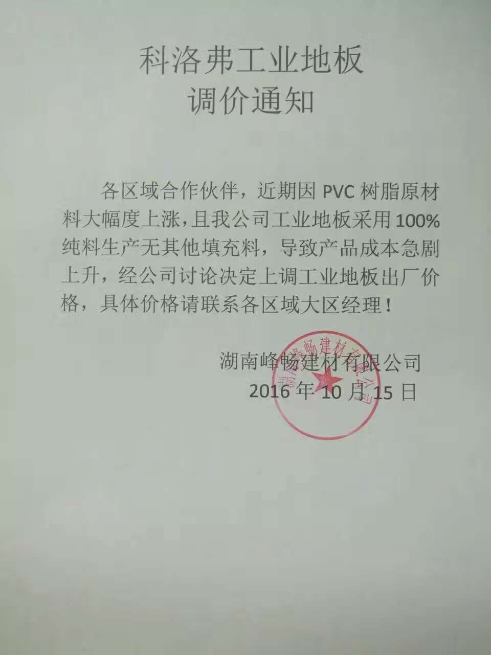 各區域合作伙伴,近期因PVC樹脂原材料大幅度上漲,且我公司工業地板采用100%純料生產無其他填充料,導致產品成本急劇上升,經公司討論決定上調工業地板出廠價格,具體價格請聯系各區域大區經理!