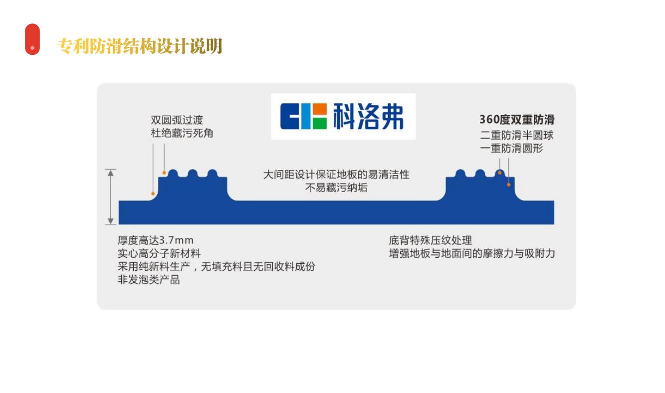 * 我們在追求產品裝飾性的同時,從不松懈對產品安全功能的完美苛求,我們使用一個獨特的技術來制造安全地板。通體采用高純度PVC生,當您的腳接觸到地板表面時,壓力壓縮PVC,地板通過特殊雙圓浮專利設計提供滑動抵抗,增強防滑功能;在壓力被釋放時,地板表面會瞬間恢復到原來的形狀,人性化的多功能用途、無與倫比的安全保護。