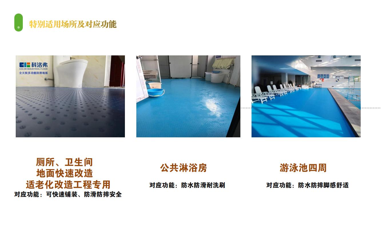 特別適用特點:1、超強防滑防摔性(360度雙重防滑專利設計、3.7mm實心高彈力納米材料結構),可防止摔倒時地面對人體產生的物理傷害。2、綠色環保,無毒無味且防霉抗菌,為老人小孩提供安全舒適的生活環境。3、超級耐磨,可保證15年以上的超長使用壽命。4、高回彈性保證了地面的高度舒適性,可減緩因行走而對人體產生的疲勞度。5、非發泡類地面材料,可支撐重物壓力,不影響輪椅推車通行,不產生壓痕